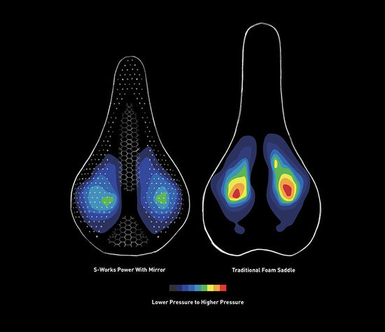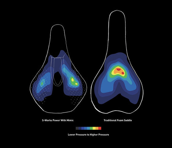 Our saddles use innovative shapes and materials like MIMIC to dramatically reduce pressure in soft tissue, seen here as blue. Designed to solve soft-tissue issues for women, MIMIC has been widely adopted by men as well.