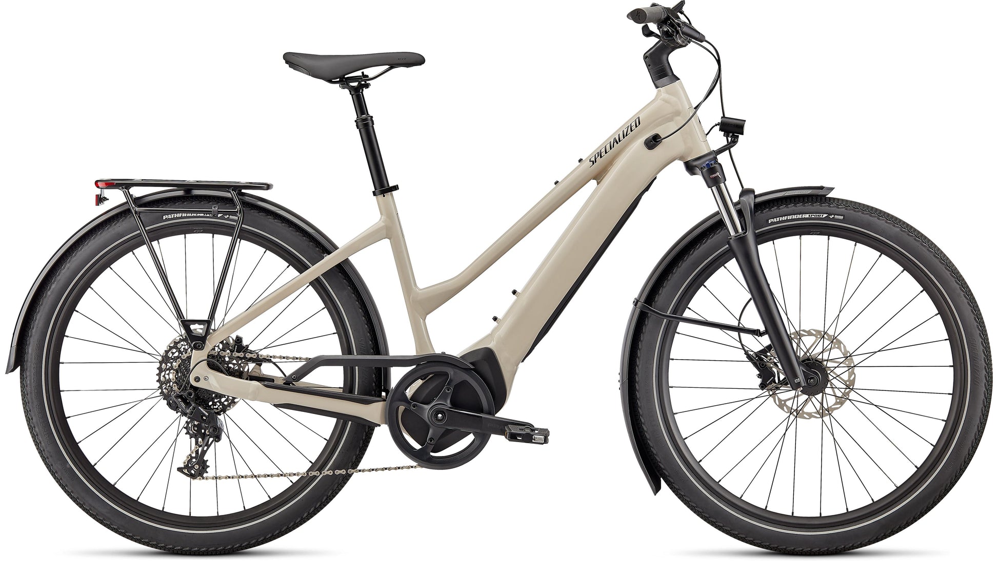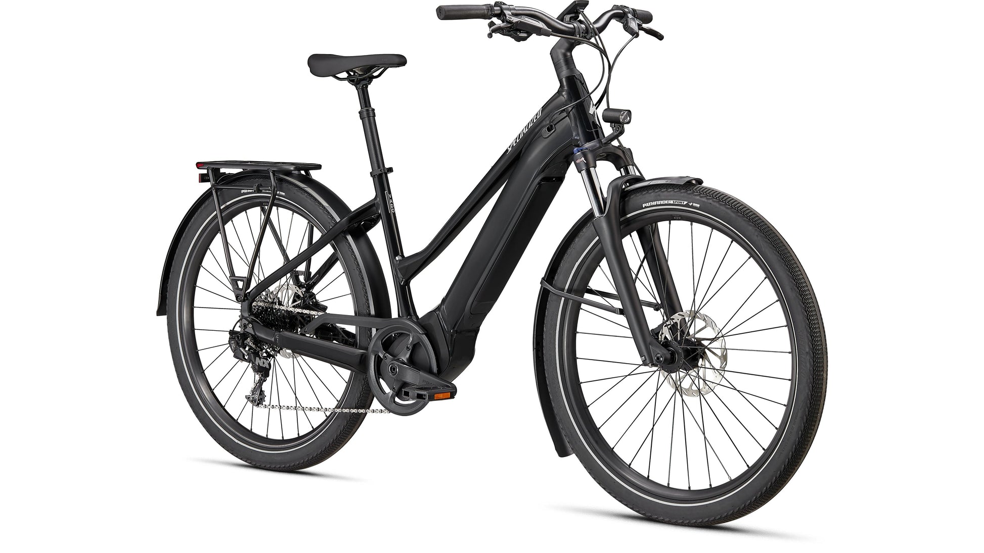 E5 Aluminum, mid-drive motor, fully integrated & lockable downtube battery, internal cable routing, wheel lock mount, and front rack compatible |